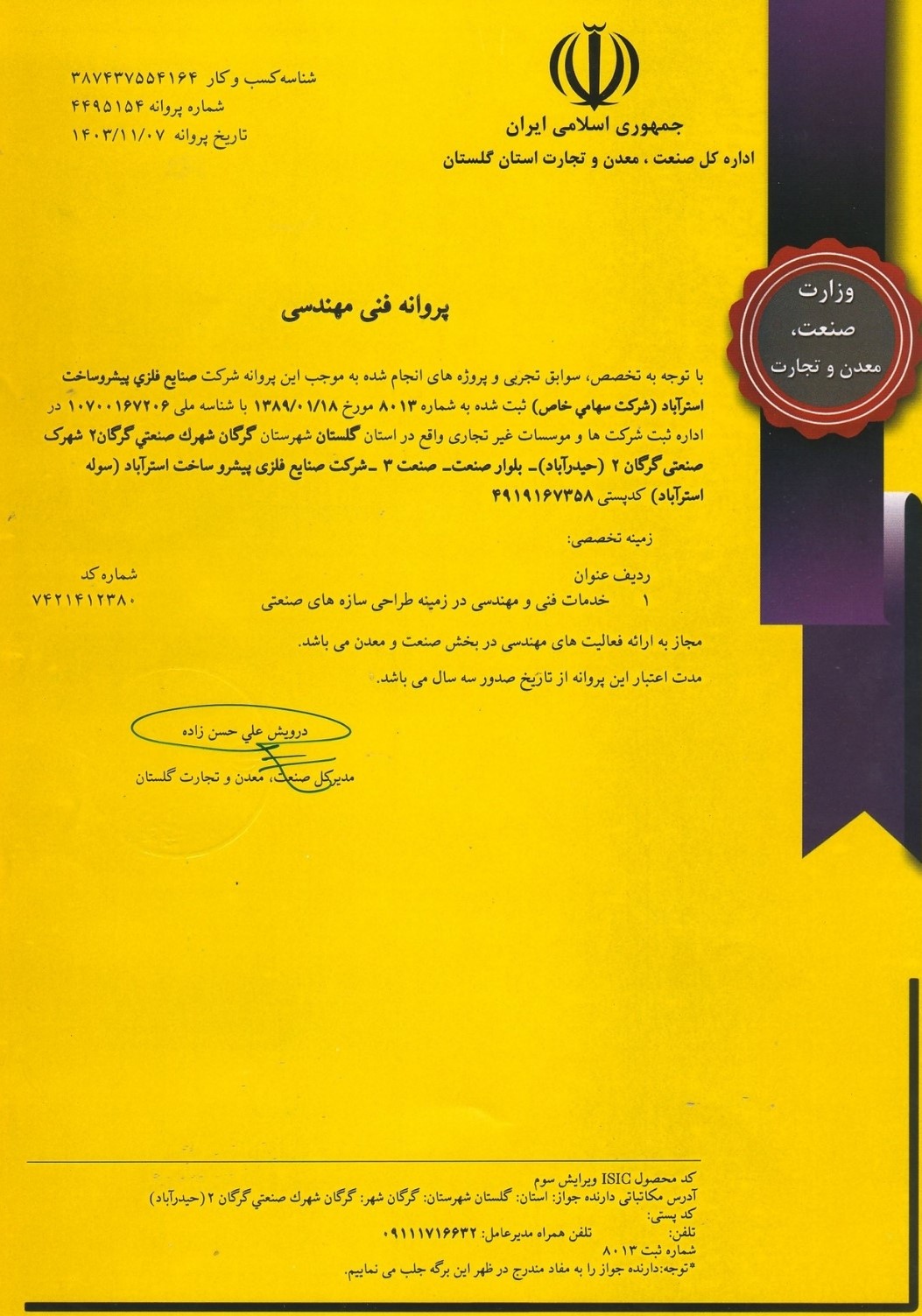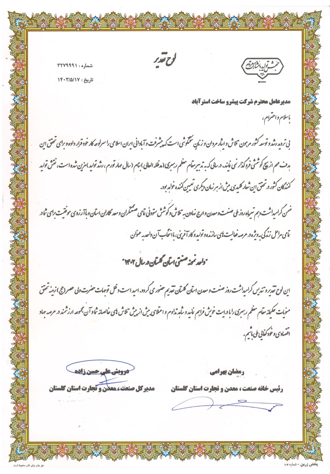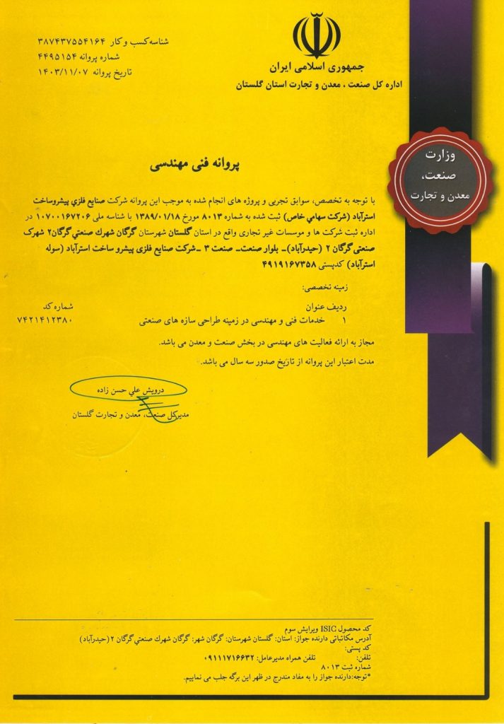 - گواهینامه تحقیق و توسعه از سازمان صنایع و معادن استان گلستان