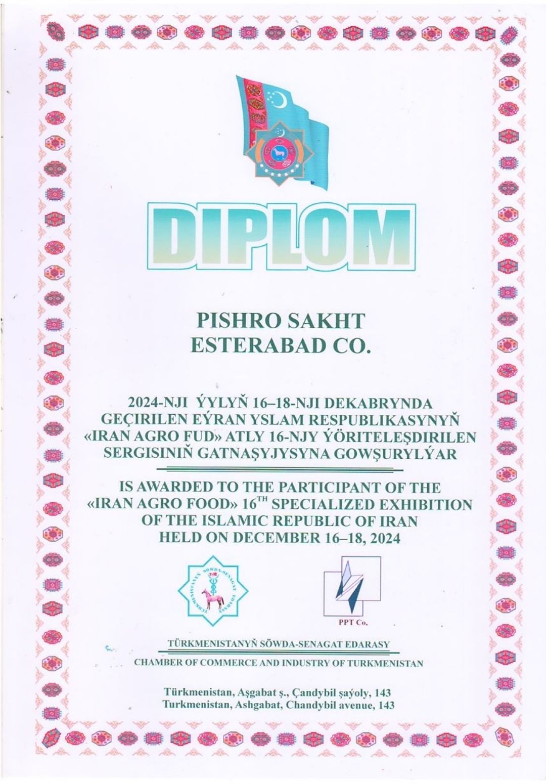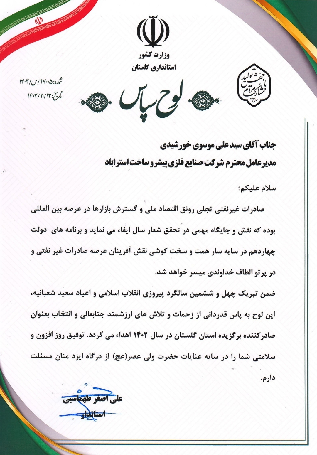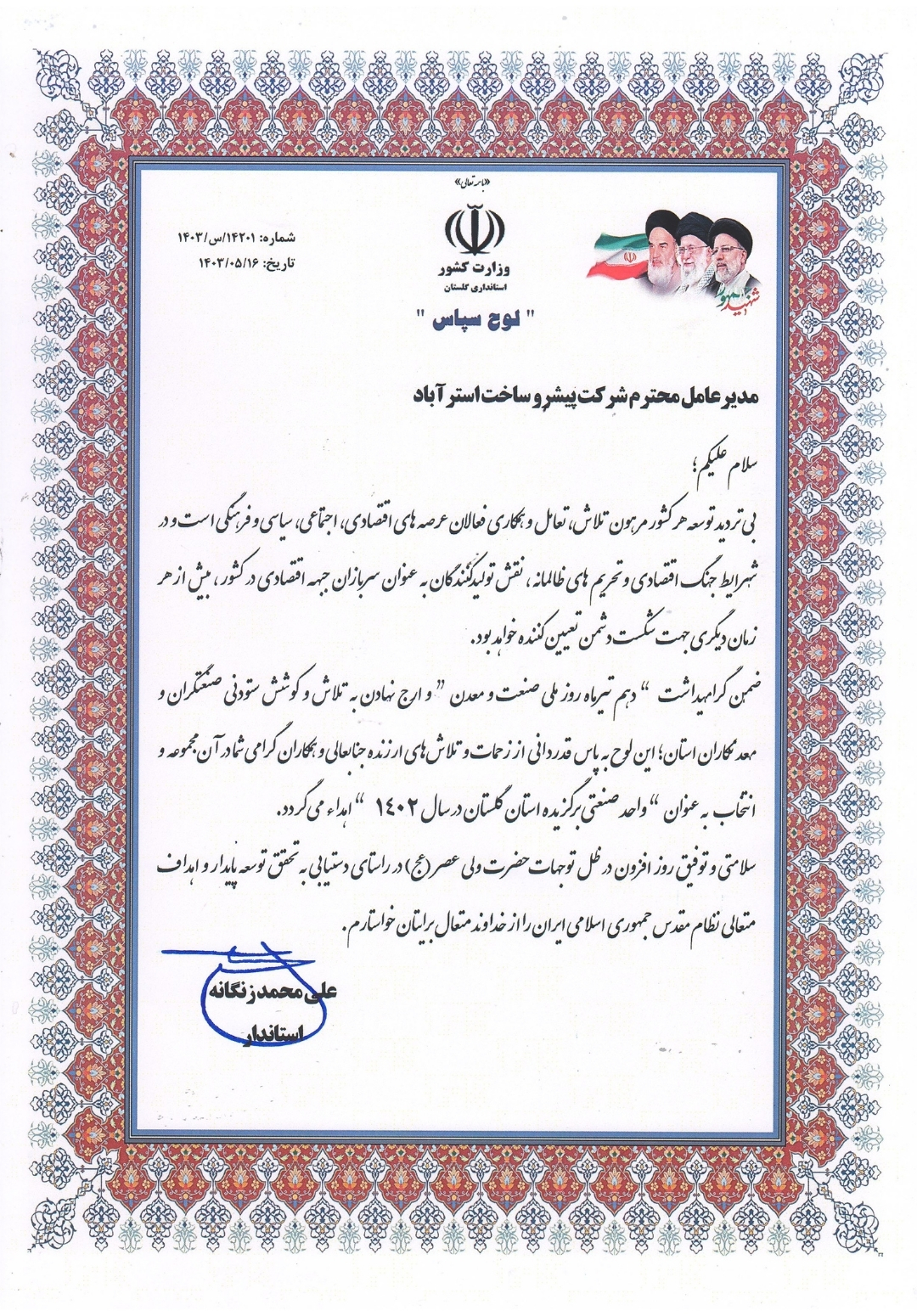 - گواهینامه تحقیق و توسعه از سازمان صنایع و معادن استان گلستان