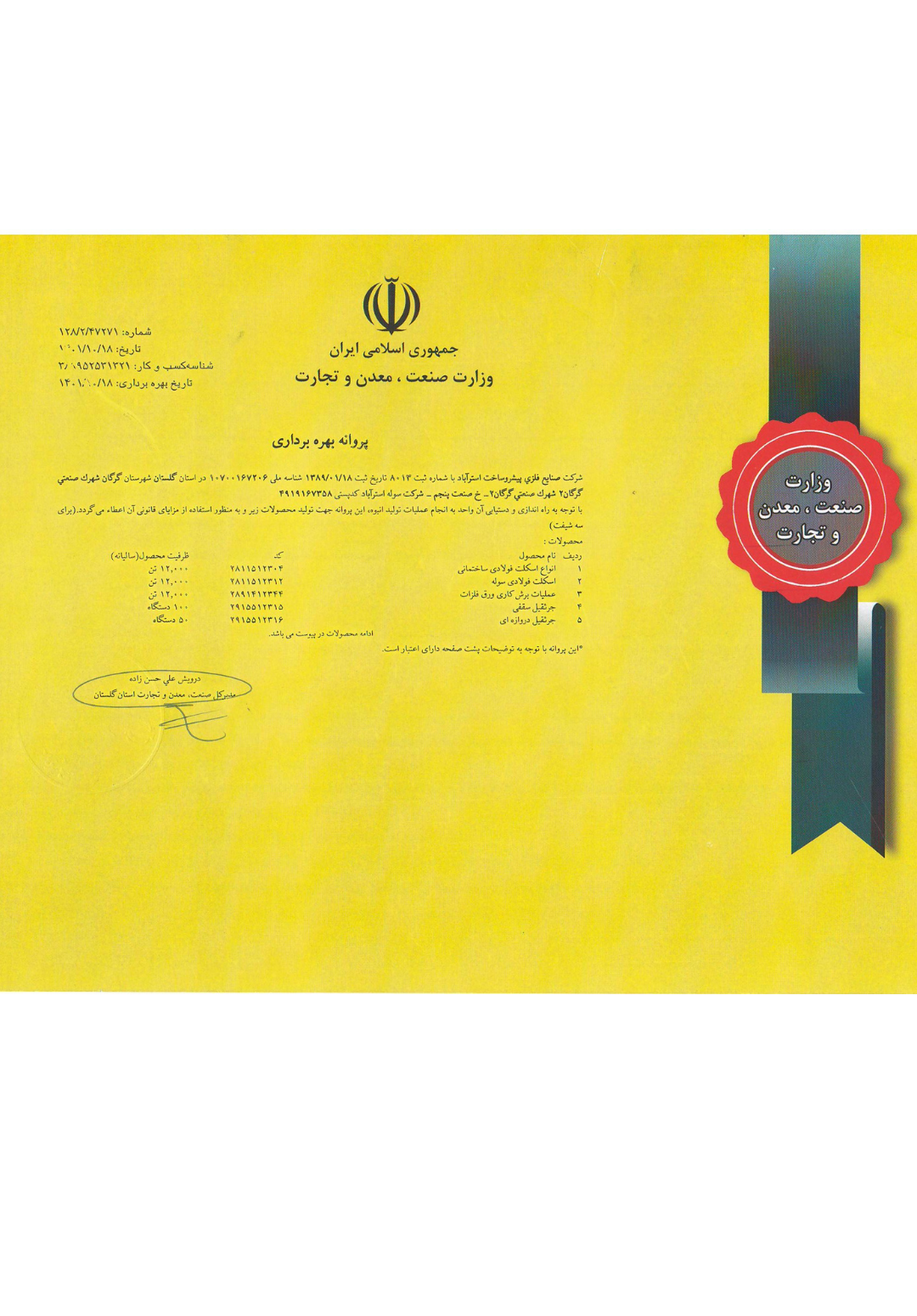 - پروانه بهره برداری از سازمان صنایع و معادن استان گلستان